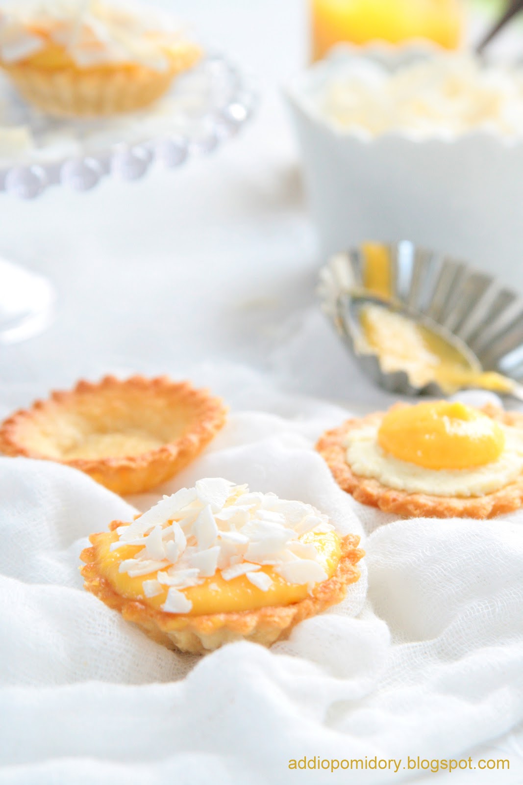 Przepis można wykorzystać do upieczenia jednej tarty lub małych kruchych babeczek, które możemy upiec wcześniej i przechowywać w szczelnie zamkniętym pudełku. Podobnie, z wyprzedzeniem możemy przygotować mango curd. Jedynie krem kokosowy, choć to akurat zajmie nam ledwie 5 minut, przygotowujemy na bieżąco. I przekładamy. I dekorujemy. I podajemy. Teraz, jutro, w łykend albo na Wielkanoc, bo wyglądem się wpisuje i mazurkiem także być może. Taka nowoczesna i na święta jednocześnie. Polecam gorąco.