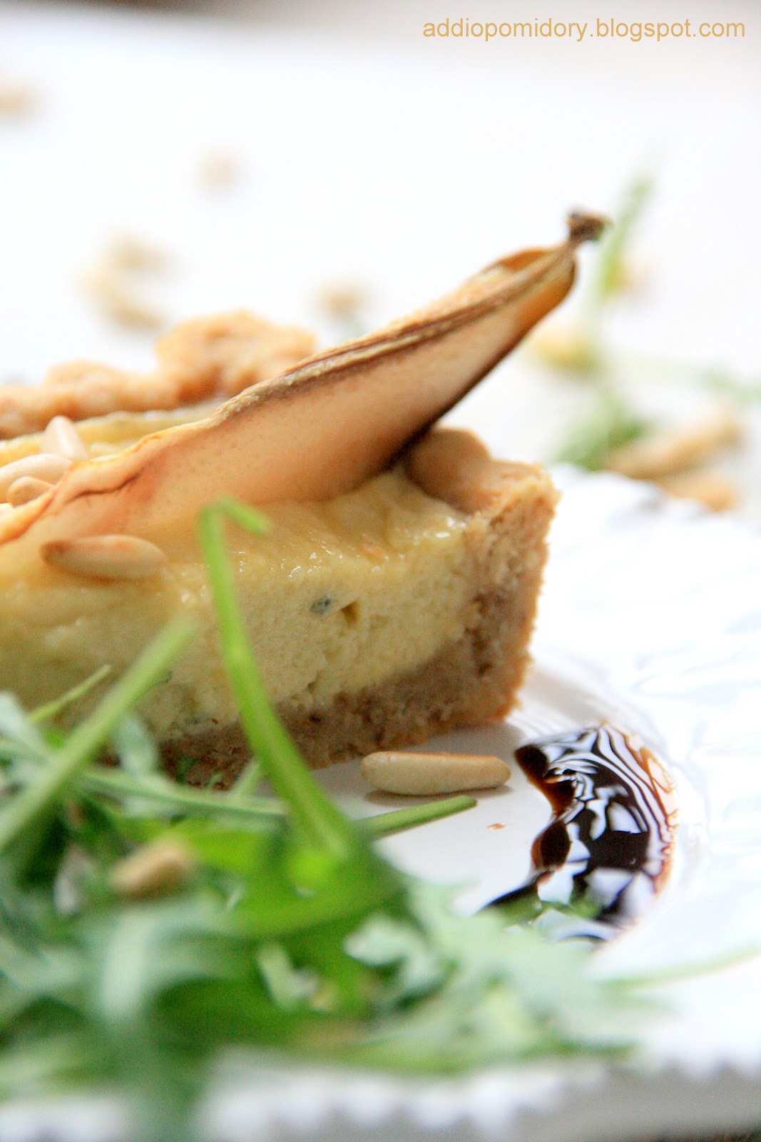 5. Na podpieczonym spodzie układamy kawałki gruszki. Całość zalewamy masą serowo-jajeczną.