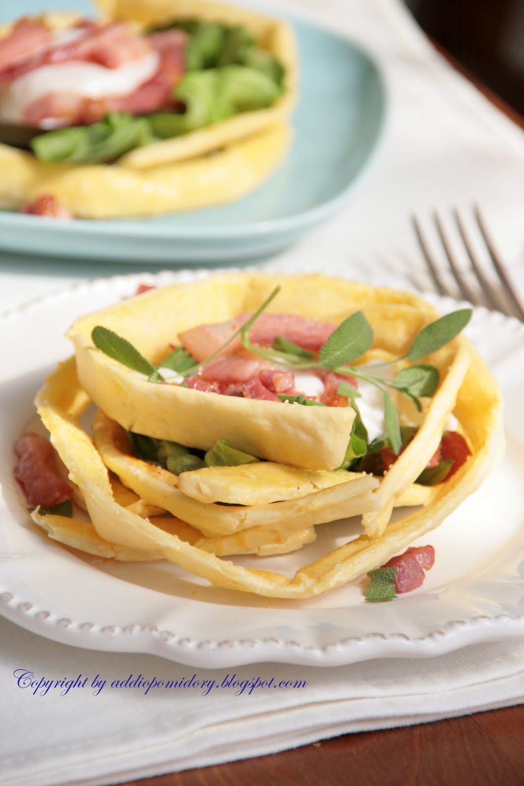 6. Przed podaniem każde gniazdko wykładamy sałata lub kiełkami. W środku układamy jajka.