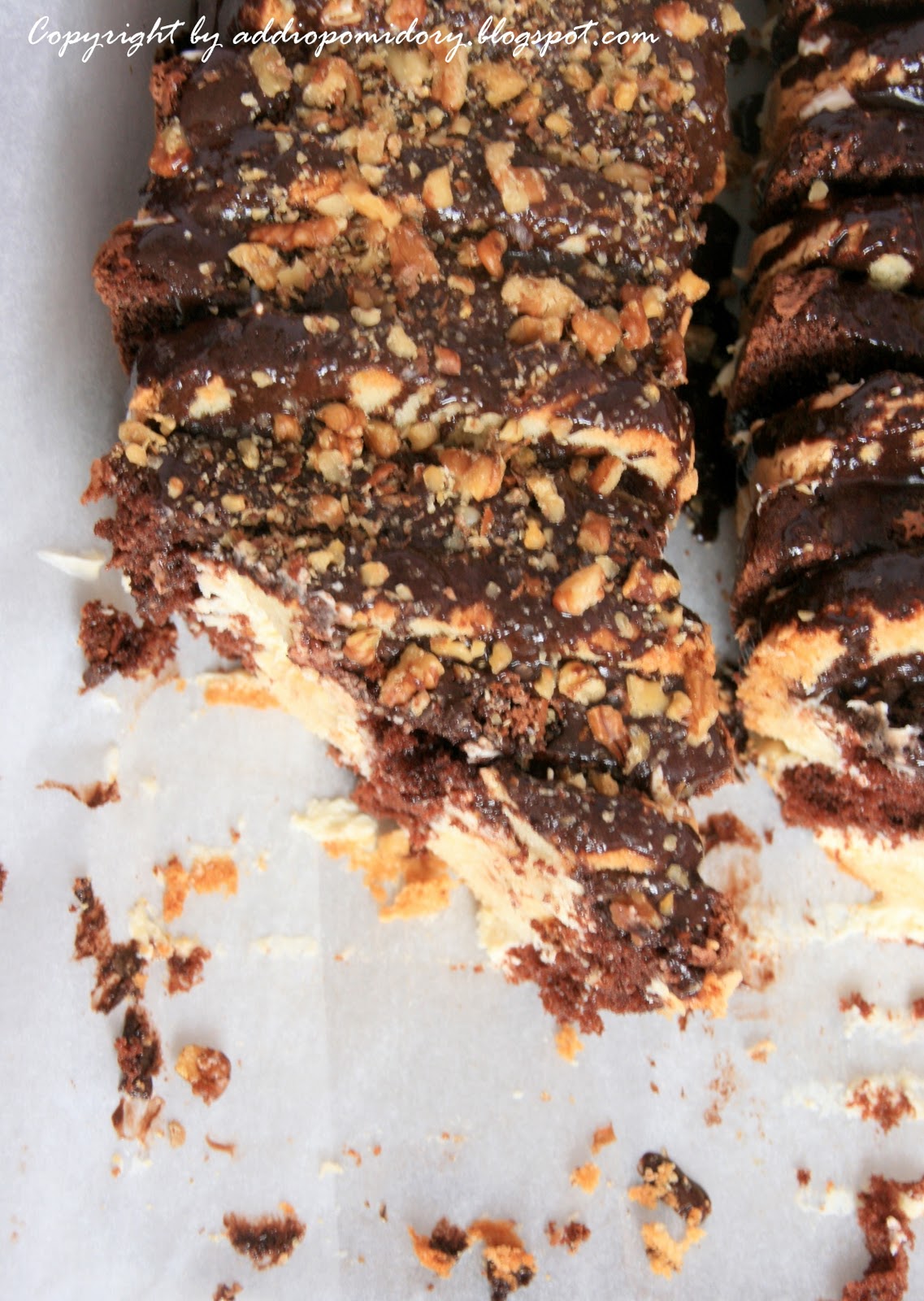3. Dekorujemy polewą czekoladową i posiekanymi orzechami włoskimi.