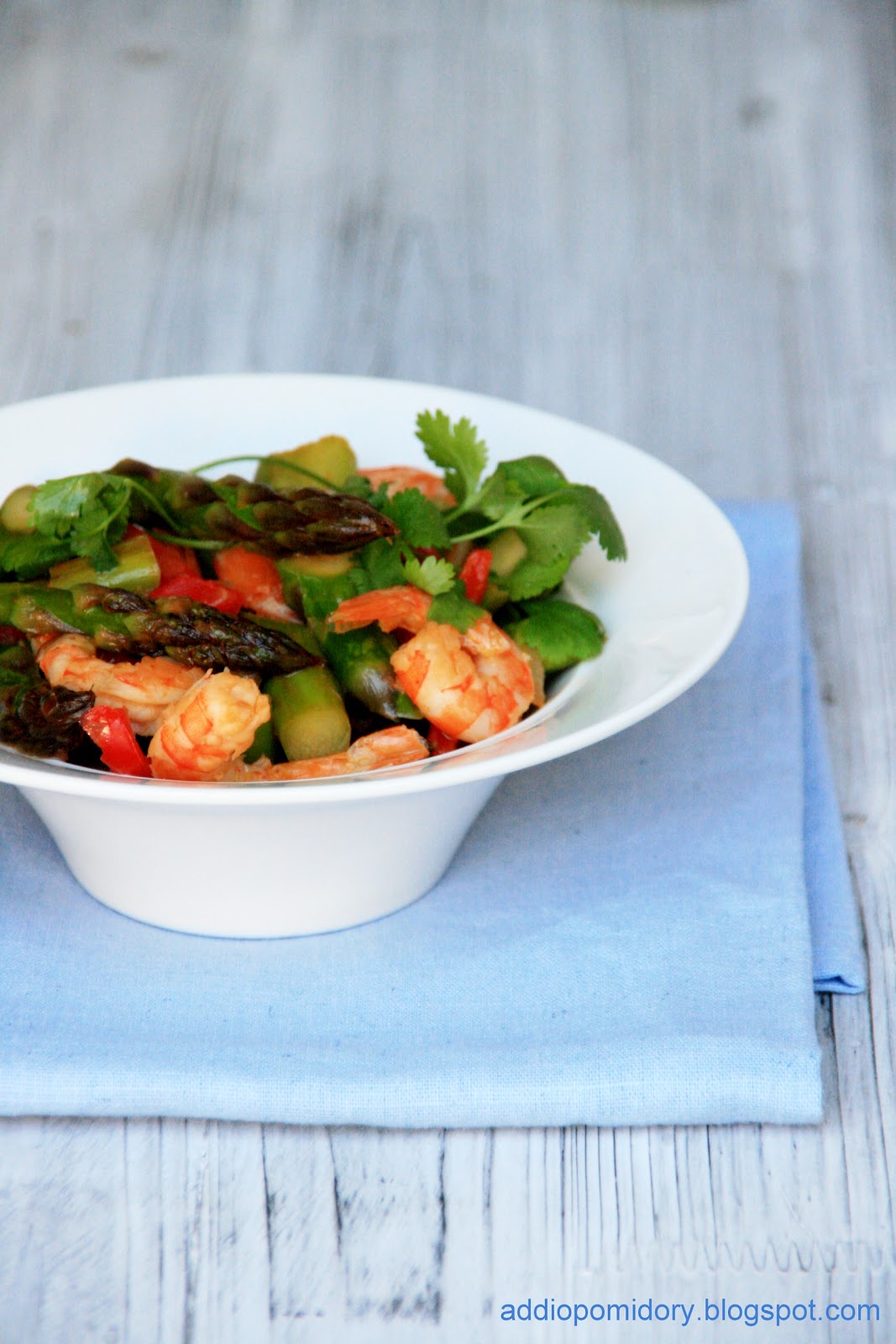 momentu, aż zacznie wydobywać się aromat. Dodajemy cebulę i szparagi, smażymy