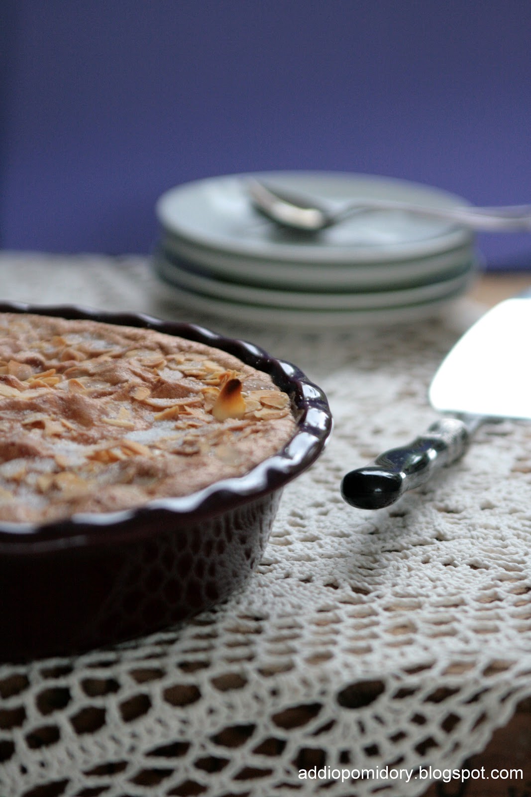 10. Jabłka układamy na podpieczonym spodzie. Zalewamy ciastem. Całość posypujemy płatkami migdałowymi.