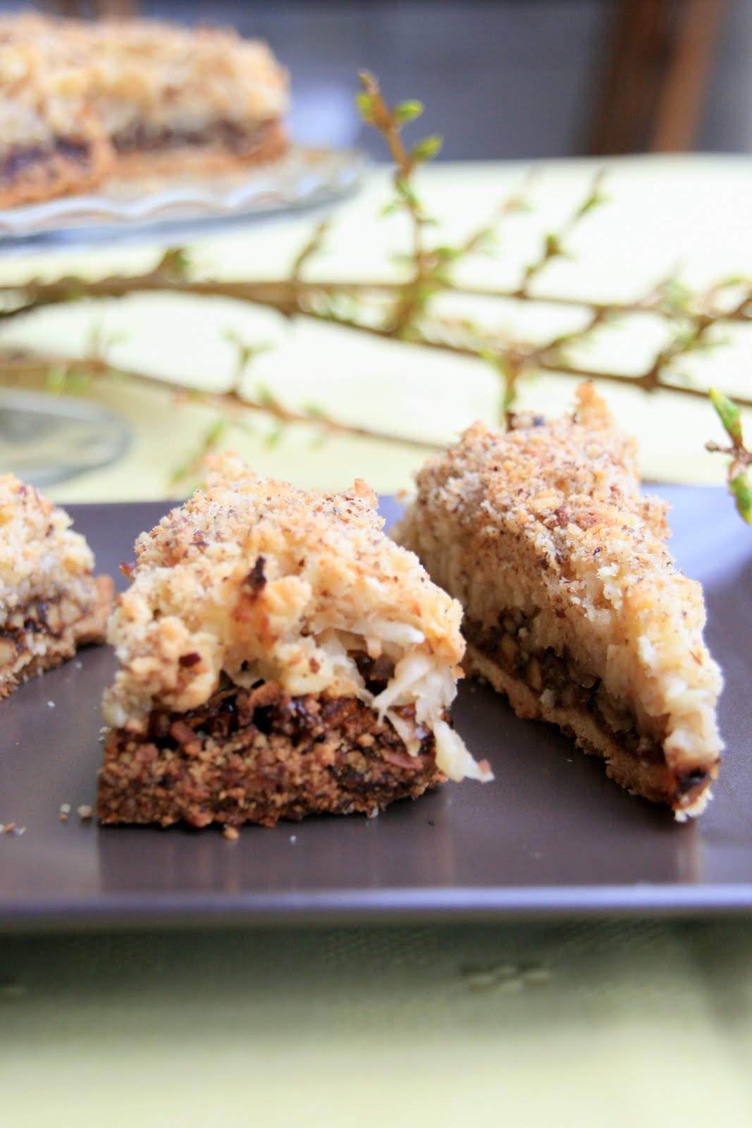 Wyszłam dziś z wiosną na spacer. Właściwie to ona mnie wyciągnęła. Dobrych kilka kroków przede mną zostawiała mi ślady, którymi podążałam wiedziona zachłannym zachwytem. Na drzewach magnolii, forsycjach i w uśmiechach bratków, w ogłuszającym śpiewie ptaków. Rzadko mam okazję do takich spacerów, a przecież zanim ona dotrze do celu swej podróży, ja mogę zgubić jej ślad, nie dostrzegając matamorfozy niesionej podmuchem letniego wiatru… Tak jak te forsycje na zdjęciach. Jeszcze przed swiętami zapowiadały swe piękno nieśmiałymi pączkami przytulonymi do smukłych gałązek. Dziś pysznią się bujną dojrzałością. I tak jak w naturze nic nie dzieje się przypadkiem, tak mnie to ciasto przydarzyło się trochę przez przypadek. Miały to być kruche rożyczki. Ale podczas procesu zwijania kruszyły się w moich nieporadnych dłoniach. Zostałam więc sama z kruchym ciastem i poczuciem klęski. Niechęć do marnotrawstwa zwyciężyła jednak i z niewielkich modyfikacji przepisu na szarlotkę z orzechami powstało ciasto orzechowo-jabłkowe. Widmo fiaska wisiało jednak nad nim nadal. Najpierw lekko przypaliłam karmel, co zresztą widać na pierwszy rzut oka, potem zupełnie nie mogłam zrobić zdjęć. Nic nie wychodziło, żadne nie było dość dobre. Chciałam już dać sobie spokój, ale mój cud-mąż powiedział: – Jeśli dasz teraz za wygraną będzie szkoda, bo jest przepyszne. Spróbuj jeszcze raz… Przekonał mnie, a po skończonej sesji nie mogłam sobie odmówić zjedzenia kilku kawałków na raz.