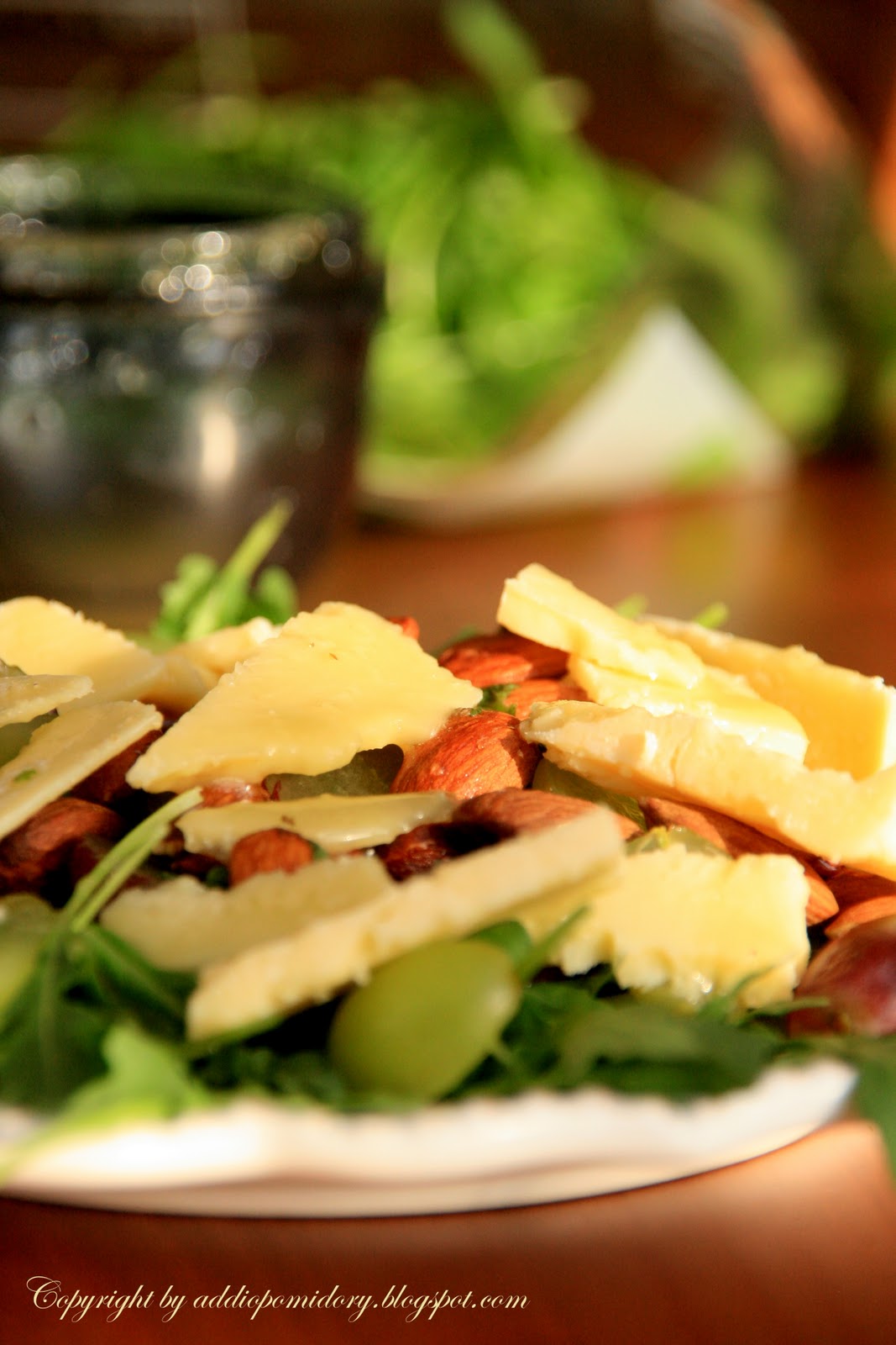 3. Posypujemy płatkami, połówkami winogron i serem pokrojonym na mniejsze cząstki.