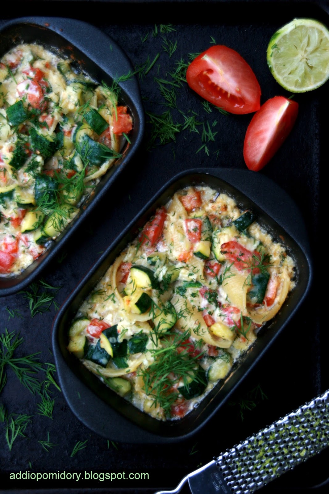 5. Na osobnej patelni rozpuszczany camemert ze śmietanką. (Śmietanę dodajemy stopniowo, zależnie od ilości sosu, którą chcemy uzyskać, u mnie to było 350). Powstałym sosem zalewamy cukinie, dodajemy pokrojone w kostkę pomidory i koperek/pietruszkę. Całość doprawiamy solą, pieprzem i sokiem z cytryny, dodajemy skórkę.