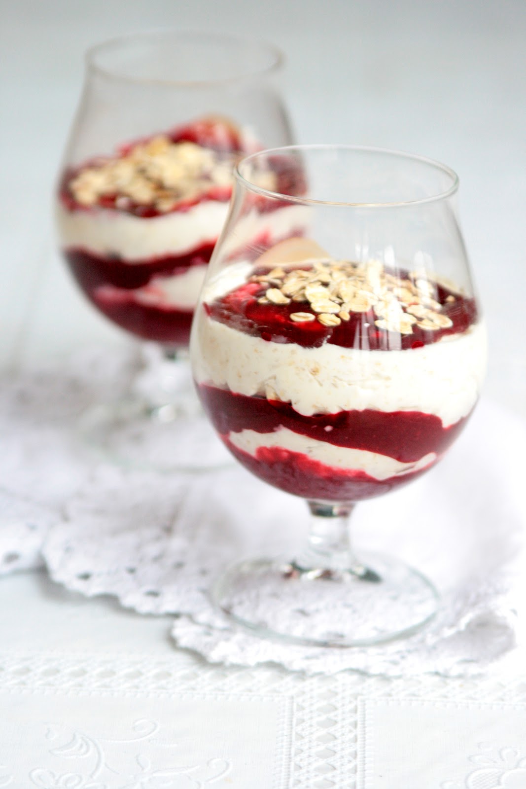 6. W szklankach układamy warstwami maliny i śmietankę. Wierzch