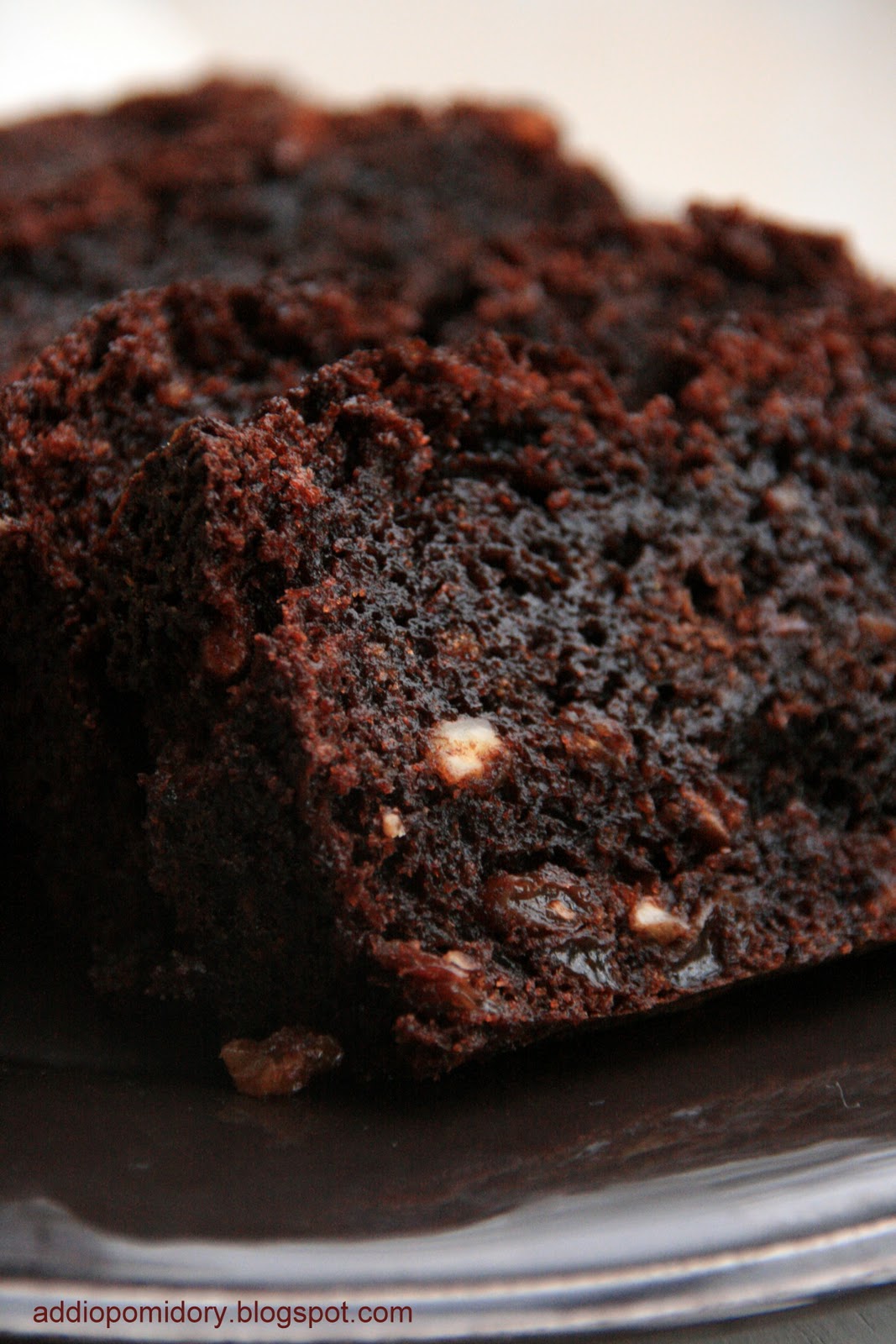 Polecam Wam gorąco to ciasto. Nie wymaga posiadania miksera. Całośc mieszamy tylko łyżką lub widelcem, jak komu wygodnie. Możemy upiec je w formie mufin, wyjdzie ich wówczas około 16 lub formie ciasta, w keksówce. Nie jest ciężkie ani zbite, ma w sobie jednak coś z brownie, ale chyba jego największą zaletą jest sam smak. Kiedy upiekłam je w formie mufin właśnie, jeszcze przed świętami, cud-mąż zjadł prawie wszystkie sam.