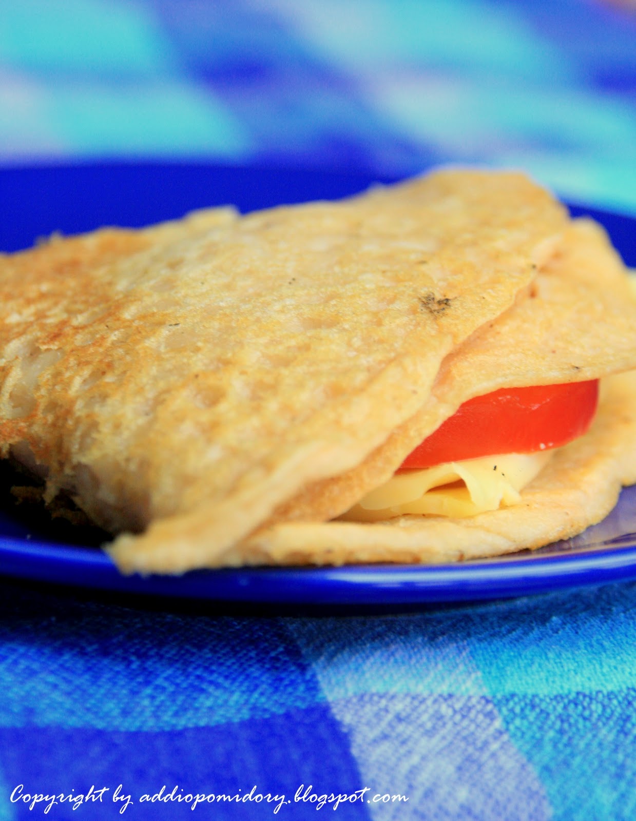 5. Na placek kładziemy cienki plaster żółtego sera, dwa plastry pomidora, składamy i podgrzewamy z dwóch stron aż ser się roztopi.