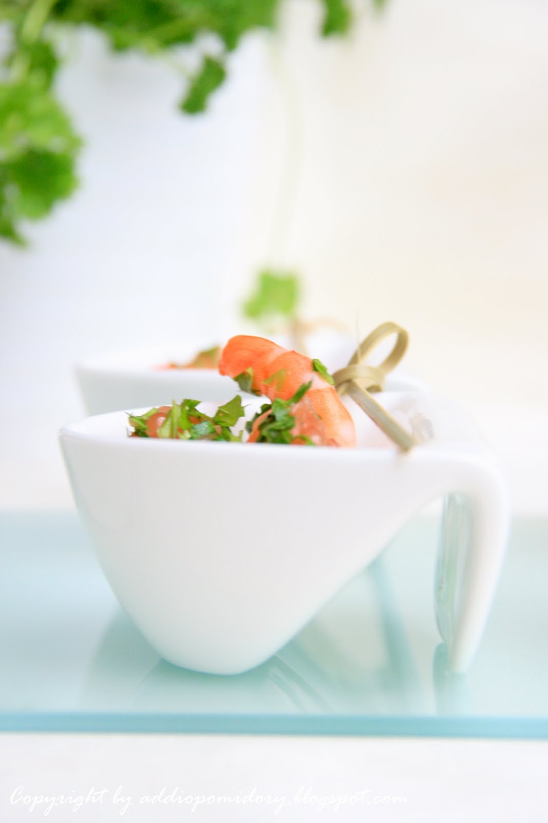 3. Kawałki grejfruta wraz z sokiem przekładamy do miseczki z krewetkami, delikatnie łączymy i przekładamy do pojemniczków, w których będziemy podawać przystawkę.