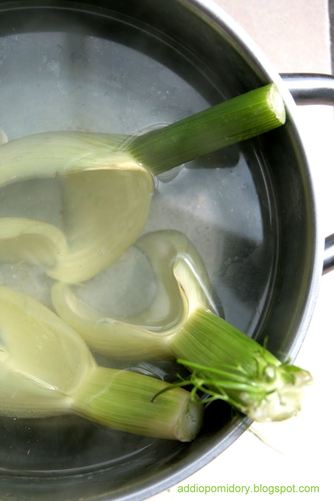 3. Odcinamy głąb w bulwie i rozdzielamy delikatnie kolejne wartstwy pozostawiając długie koncówki łodygi. Myjemy je dokładnie. Najładniejsze pozostawiamy do faszerowania. Pozostałe kroimy drobno, dodamy je do farszu. Stawiamy w garku w pionie, tak aby łodygi wystawały ponad poziom wody (tak jak na zdjęciu). Gotujemy 10-15 minut. Przekładamy na sito.