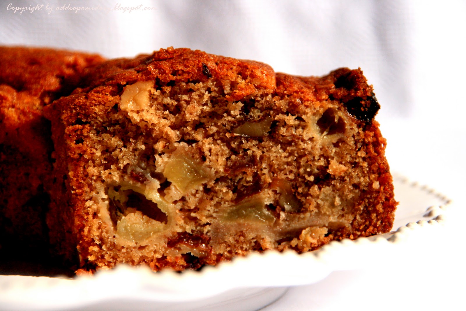 Pachnie trochę jak piernik, jest wilgotny, ciężkawy. Dodałam 4 jabłka, po 50g rodzynek i orzechów, oraz zmniejszyłam ilość cukru o 40g (30 miałkiego, 10 pudru). Ten wypiek na pewno nie raz powtórzę.