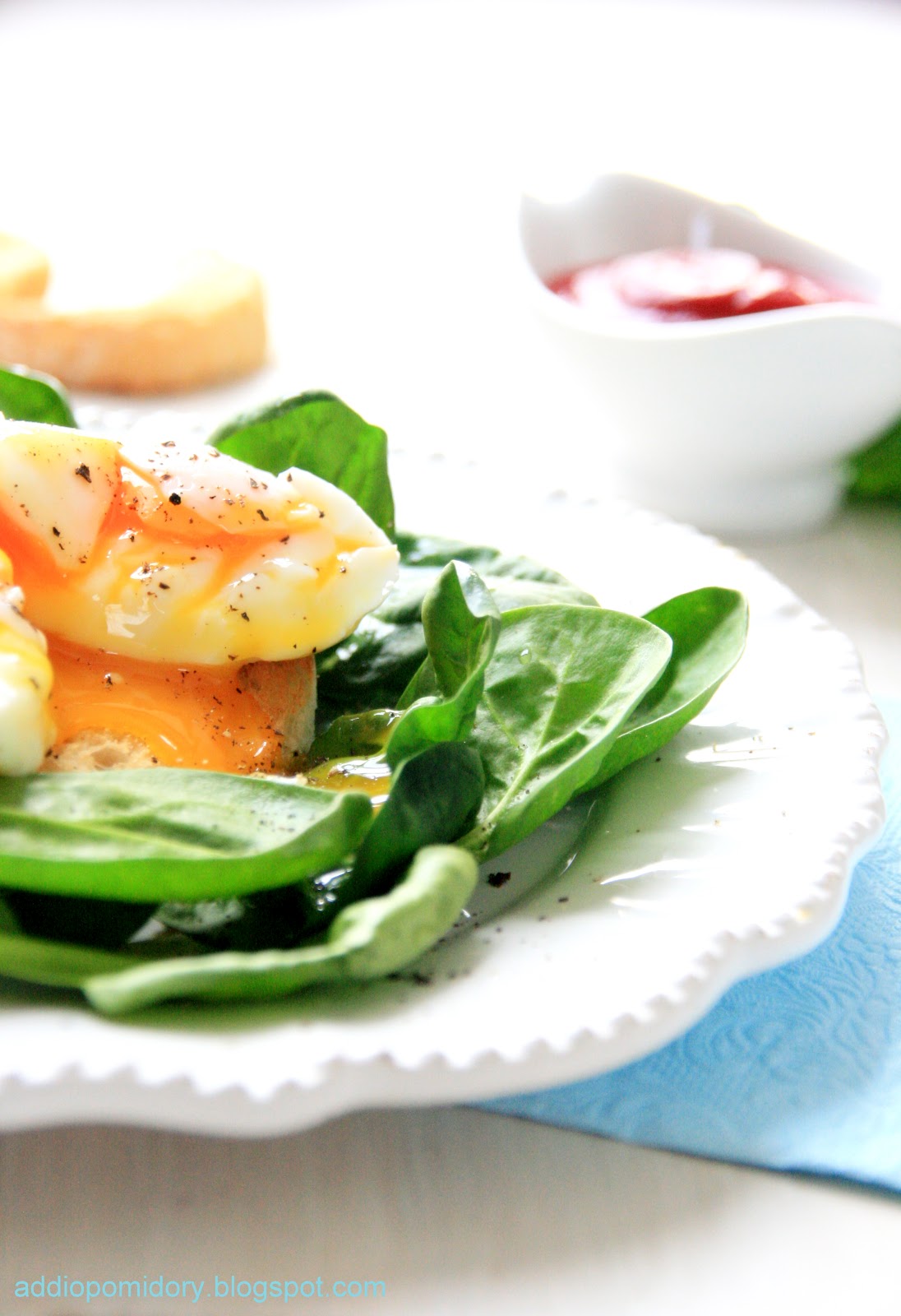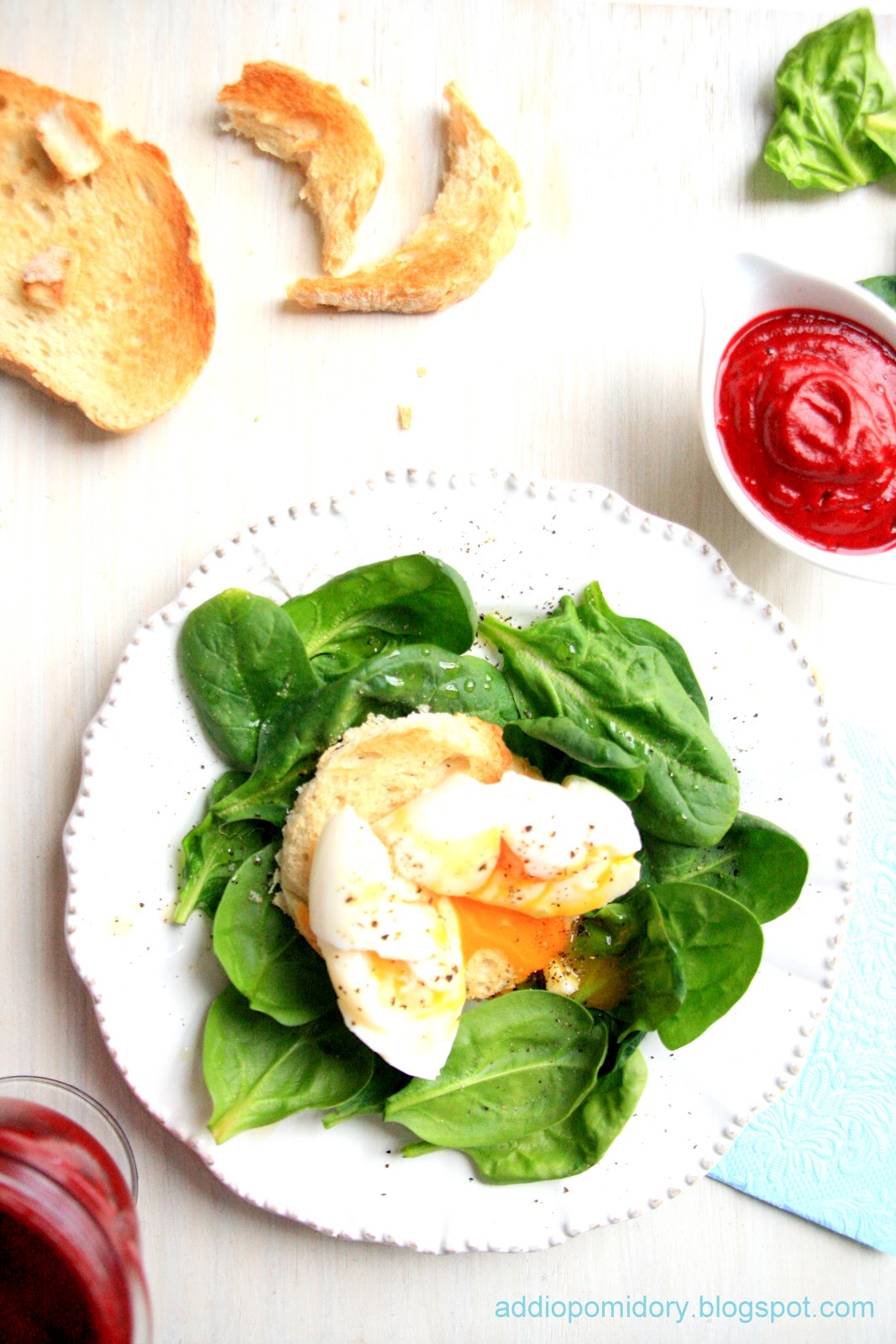 3. Na talerzyku układamy liście szpinaku lub rukoli. Spryskujemy je oliwą.