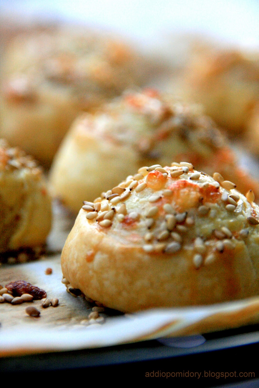 3. Układamy je na blasze wyłożonej pergaminem, na płasko. Smarujemy białkiem i posypujemy sezamem.