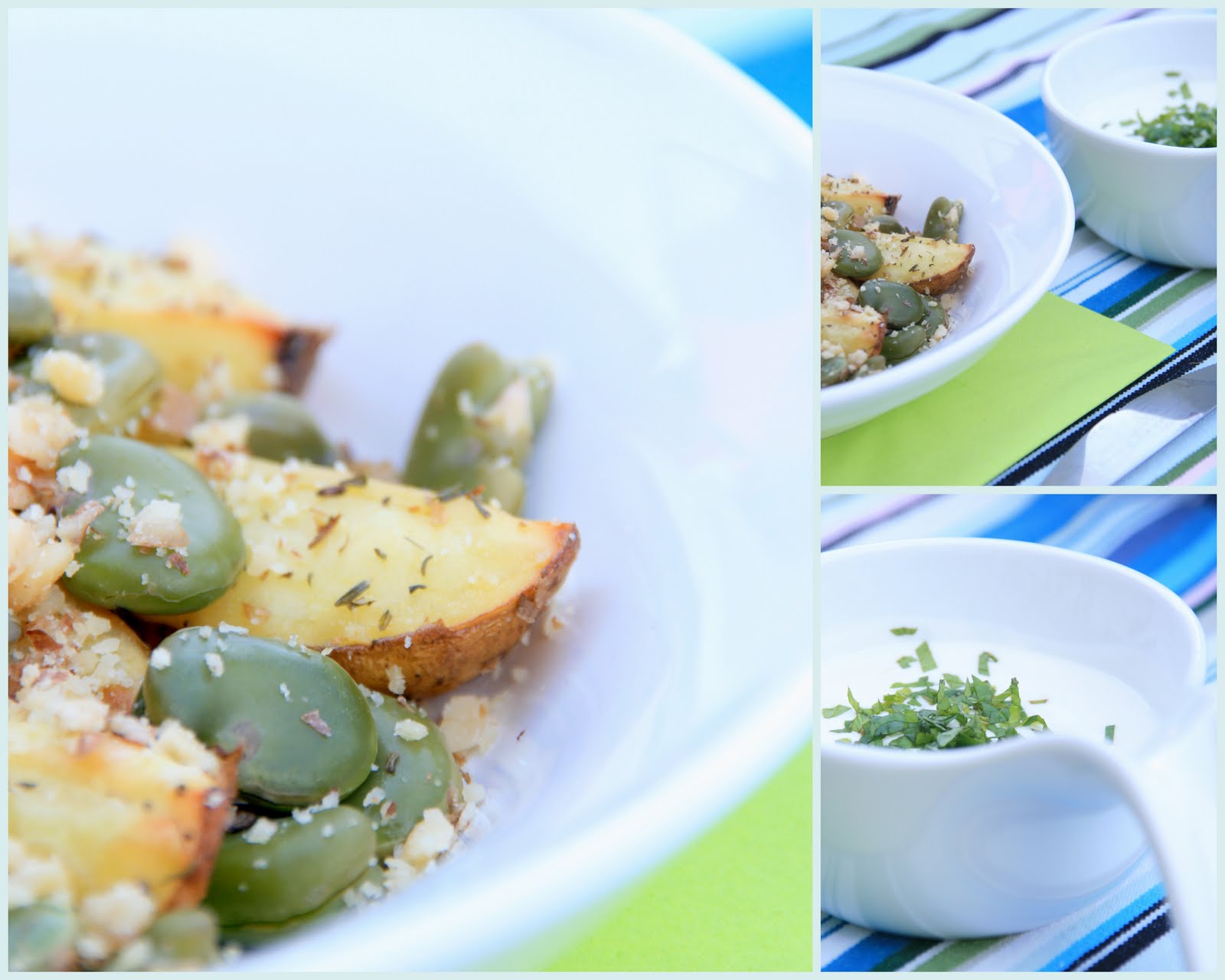 3. W głębokim talerzyku układamy ziemniaki, posypujemy je gęsto bobem, następnie orzechami. Spryskujemy sokiem z sytryny.