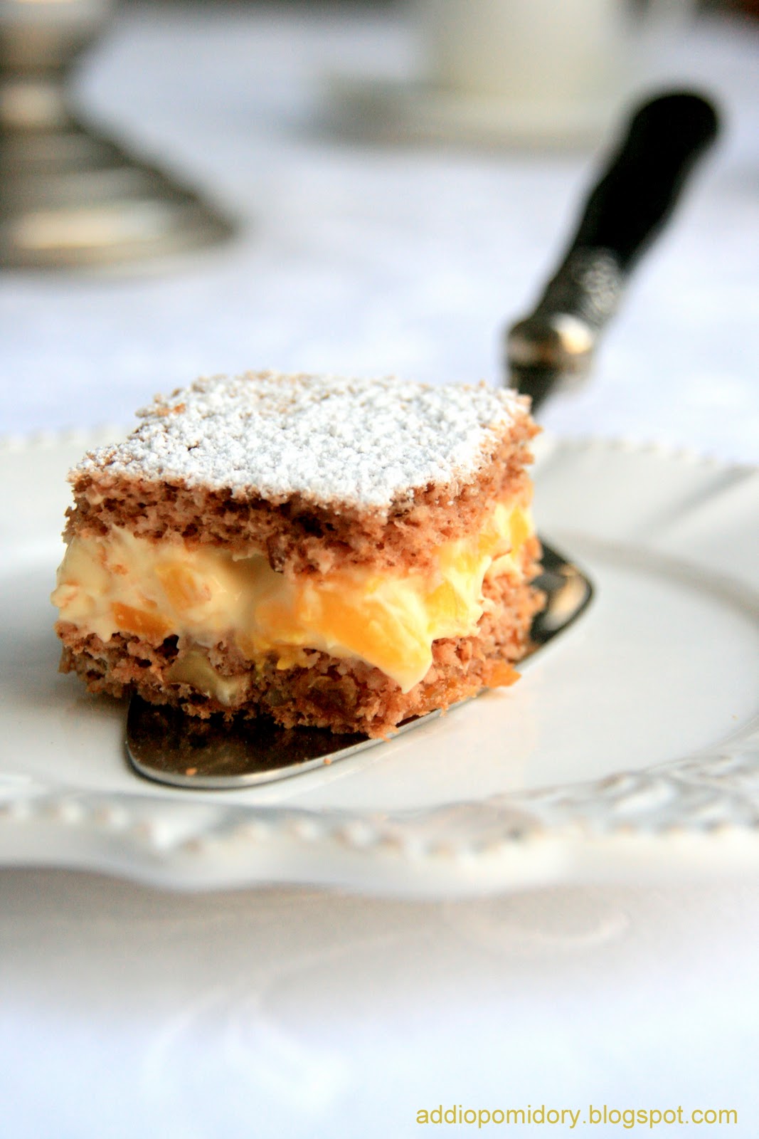 ciasto orzechowe + połowa kremu + warstwa delicji + połowa kremy + brzoskwinie + galaretka brzoskwiniowa 🙂