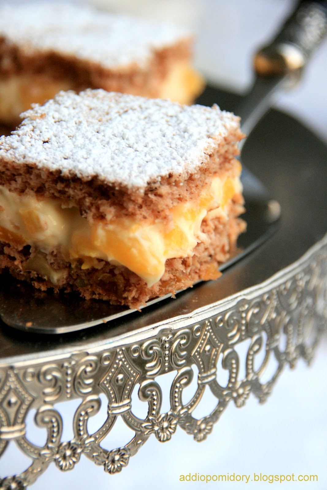 Nazywam ją wersją de luxe, ale po prawdzie taka była jego pierwotna, oryginalna wersja. Na placek pierwszy wykłada się ½ masy. Na to układamy delicje, czekoladą do dołu, namoczone wcześniej w kawie ze spirytusem. Następnie pozostałą część masy, na której układamy kawałki brzoskwiń. Całość przykrywamy drugim plackiem.