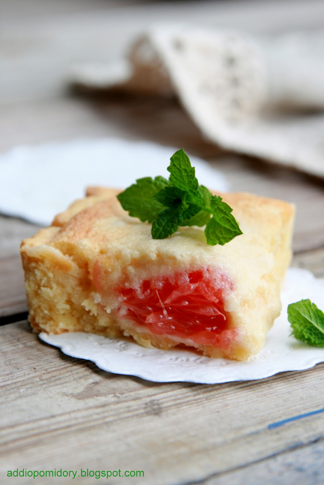 Pamiętam jeszcze, że w piątek oniemiałam w zachwycie nad tym ciastem. Może to i nieskromnie brzmi, ale nie zdarzyło mi się jeszcze nigdy osiągnąć dokładnie takiego efektu, jaki sobie wymarzyłam. Zazwyczaj przewiduję, rozpisując listę składników, że coś powinno wyjść tak i tak, mieć taką konsystencję i tak smakować. Ale nigdy jeszcze efekt nie zaskoczył mnie tak bardzo pozytywnie. Kruchy spód jest idealnie kruchy, lekki i nie nasiąka (specjalnie zostawiłam sobie kawałek na drugi dzień, żeby to sprawdzić po kilkunastu godzinach). Marcemanowa masa ma delikatną, trzeba przyznać, bardzo słodką konsystencję, która świetnie kontrastuje z kwaśnością grejfruta a grejfrut jest soczysty i nie rozpada się. Jest dość wykwintne w smaku, to słowo bardzo do niego pasuje. Polecam gorąco i zapraszam już wkrótce.