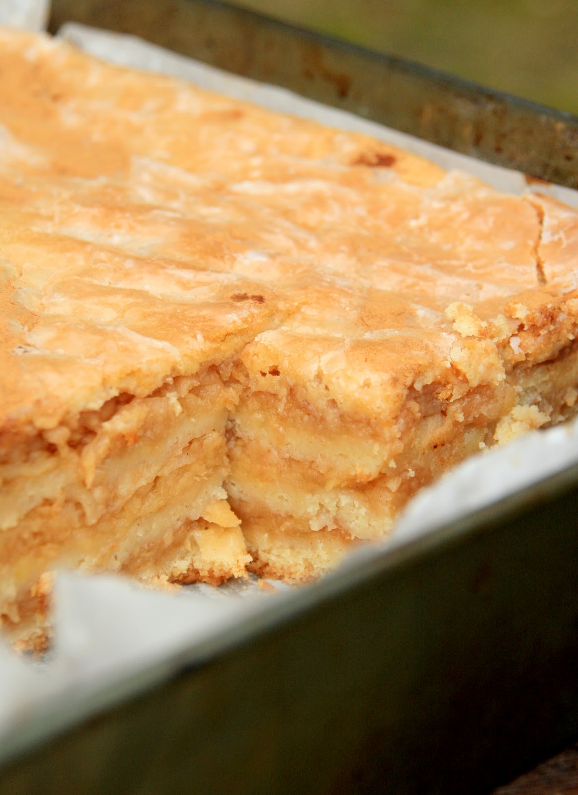 3. Każdą część ciasta wałkujemy, nadając jej kształt blachy. Rozwałkowany placek układamy na blasze posmarowanej tłuszczem”. Na ciasto dajemy 1/3 przygotowanych jabłek, nakrywamy drugim plackiem i zlepiamy brzegi.” Tak samo postępujemy z następnymi dwoma plackami, przekładając je pozostałymi jabłkami. Ciasto smarujemy po wierzchu jajem lub mlekiem, nakłuwamy dość gęsto widelcem, posypujemy cukrem, wstawiamy do gorącego piekarnika. Po upieczeniu posypujemy cukrem pudrem krajemy w niewielkie kwadraty”.
