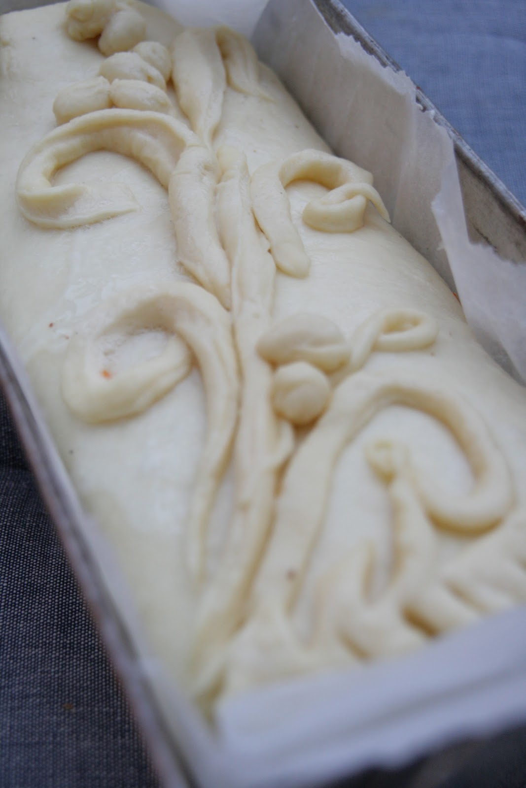 4. Zwijamy ściśle zaczynając od boku przykrytego farszem. Formujemy rulon, który wkładamy do keksówki. Dekorujemy dowolnie skrawkami ciasta. Pozostawiamy do wyrośnięcia na około ½ godziny. Całośc smarujemy białkiem.