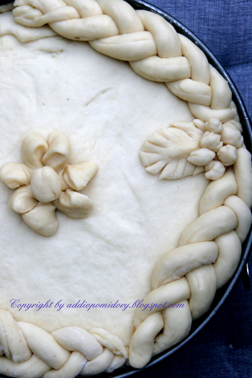 4. Zaplatamy cienki warkocz z ciasta i układamy go dla ozdoby na wierzchu lub wykonujemy inne, dowolne dekoracje z ciasta.