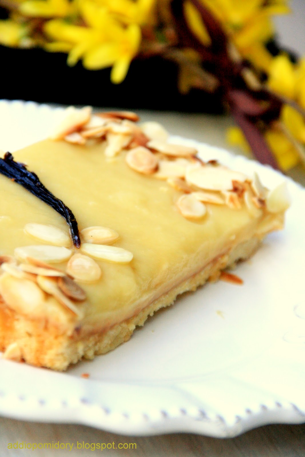 1. Przygotowujemy kruchy spód. Łączymy sypkie składniki. Mieszamy. Wysypujemy na stolnicę. Robimy zagłębienie, w które wbijamy żółtko, dodajemy śmietanę i pokrojone w kostkę masło. Siekamy całóść, wyrabiamy szybko. Zawijamy w folię i wstawiamy do lodówki na 45 minut.