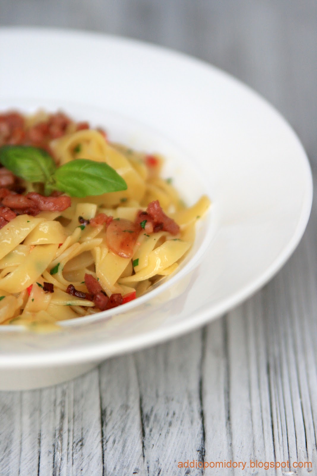 patelni podsmażamy na chrupko boczek. Posypujemy nim makaron przed podaniem.