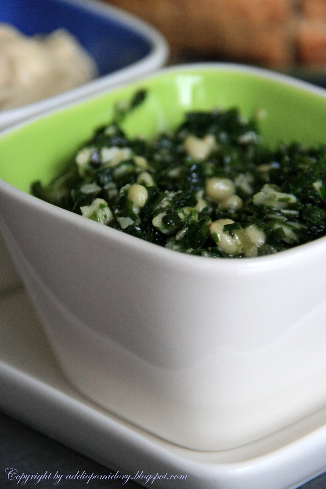 Siekamy wszystkie zioła, mieszamy je z czosnkiem, pokruszonymi w dłońmi płatkami parmezanu i piniami. Zalewamy oliwą do konsystencji pasty, doprawiamy sokiem z cytryny.