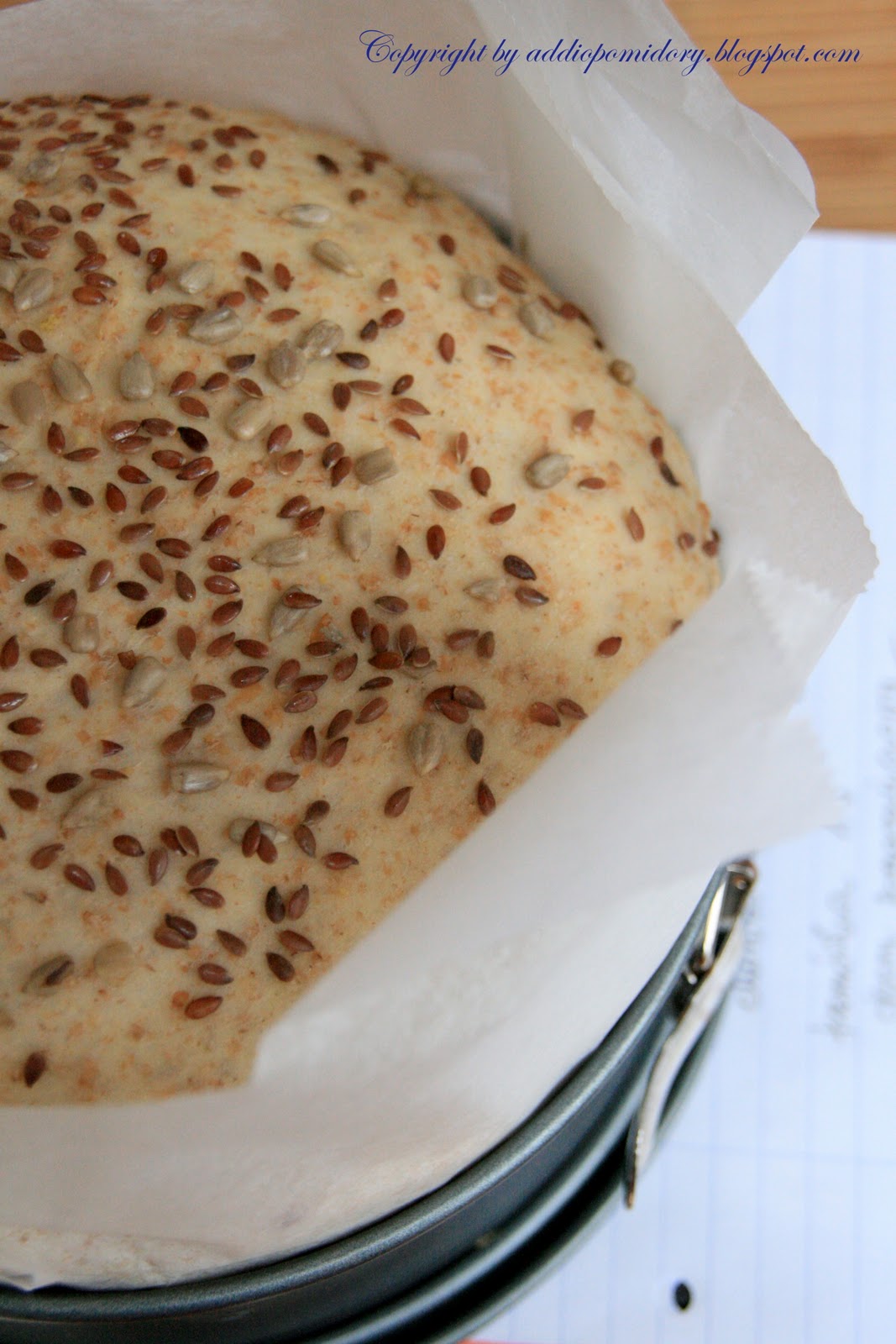 5. Po tym czasie ciasto jeszcze raz krótko wyrabiamy, osypujemy ziarnami i umieszczamy w formie do pieczenia. Użyłam tortownicy o średnicy 20 cm, którą wyłożyłam pergaminem, by wystawał wysoko ponad brzeg foremki, tak jak widzicie na zdjęciu. Pozostawiamy ponownie do wyrośnięcia do podwojenia objętości**.