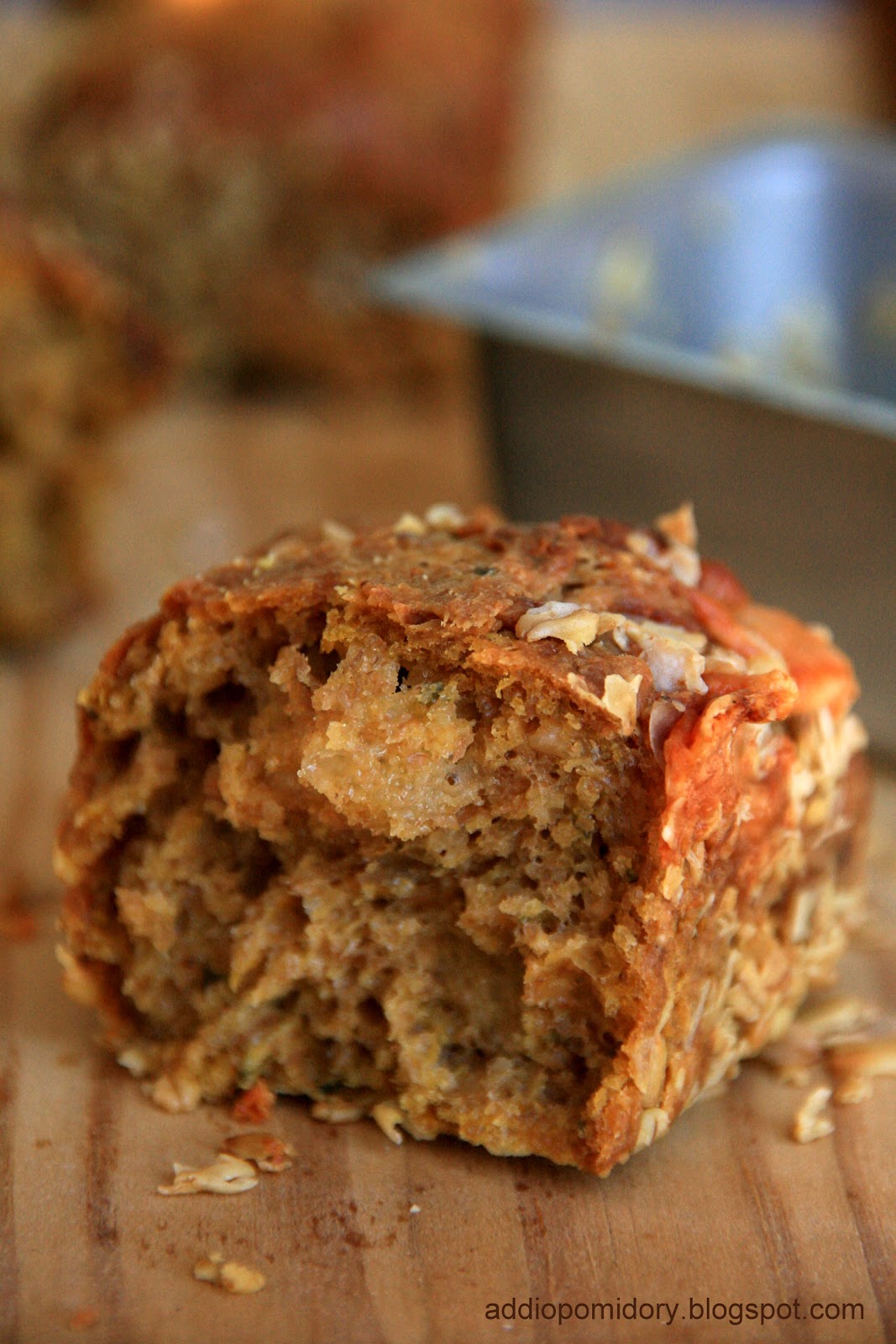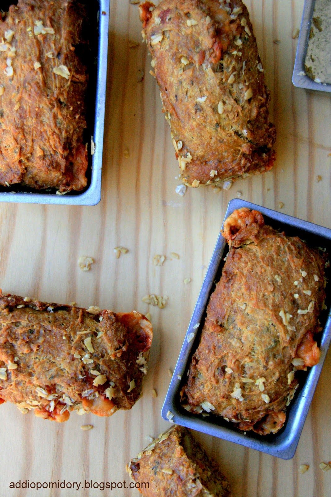 4. Po tym czasie ciasto mieszamy, dodajemy ser i oliwę. Foremki smarujemy oliwą i wysypujemy otrębami owsianymi lub też – wersja light – wykładamy pergaminem. Przekładamy do jednej keksówki (o długości nie większej niż 23 cm) lub kilku małych (użyłam 6 małych foremek o wymiarach 5,5 x 10 cm), możemy także formować bułki podsypując odrobinę mąki. Przykrywamy, odstawiamy jeszcze na 20-30 minut w ciepłe miejsce.