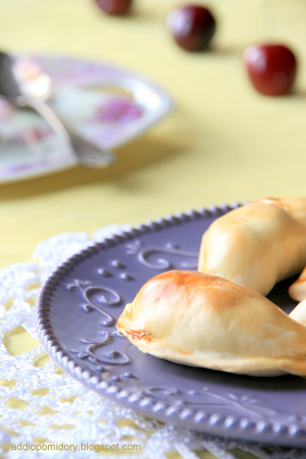 I kiedy tak lepię po raz nie wiem który kolejnego pieroga myślę sobie, że muszę coś zmienić. Opowiadam więc o pierogowej klasyce i lepimy ruskie ale obok już czekają czereśnie z imbirem. Dziś zrobimy też pieczone pierogi na słodko. Zupełnie inne. Przypominają kruche ciasteczka i są bardzo uniwersalne. Farsz może być dowolny, jesienią koniecznie jabłkowy, latem jeszcze sprobujemy ze śliwkami. Ciasto jest delikatne i kruche. Smakują niesamowicie z popołudniową herbatą. Polecam gorąco.