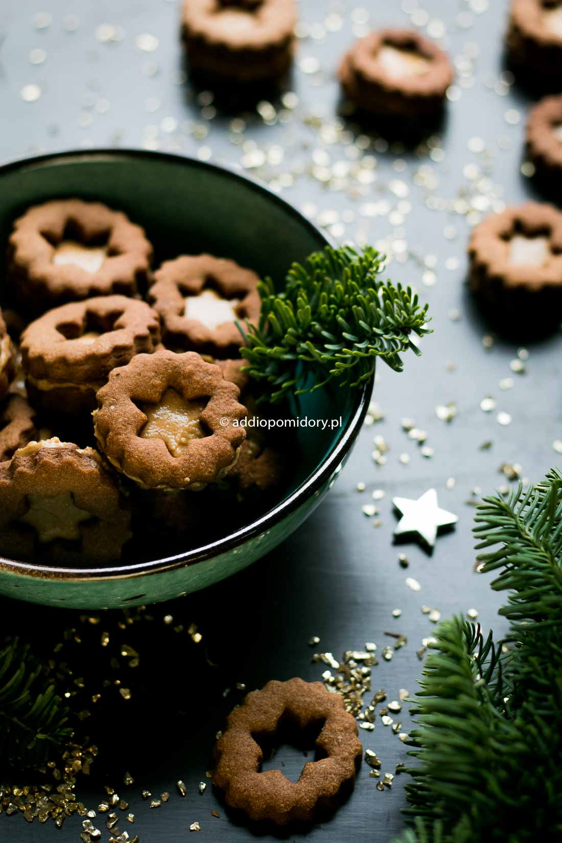 Stali czytelnicy Addio wiedzą, że mam swój ulubiony przepis na pierniczki, są to pierniczki Janki. W tamtym roku moja ulubiona stała czytelniczka Jola przysłała mi przepis, który w jej rodzinie jest od lat, gorąco go polecając. Zapisałam go sobie na następny sezon pieniczkowy i kiedy nadszedł – był pierwszym, który wpróbowałam. I wiecie co? Jest świetny. Ciasto jest plastyczne, super się z nim pracuje. Pierniczki są idealne w smaku i strukturze. Przygotowałam z nich markizy, które przełożyłam masłem orzechowym. TO połączenie to naprawdę zgubne odkrycie. Głeboki sma i słodycz pierniczków w połączeniu z masłem orzechowym to uczta, a odejść od stołu nie sposób. Uzależniłam się, co tu dużo mówić…