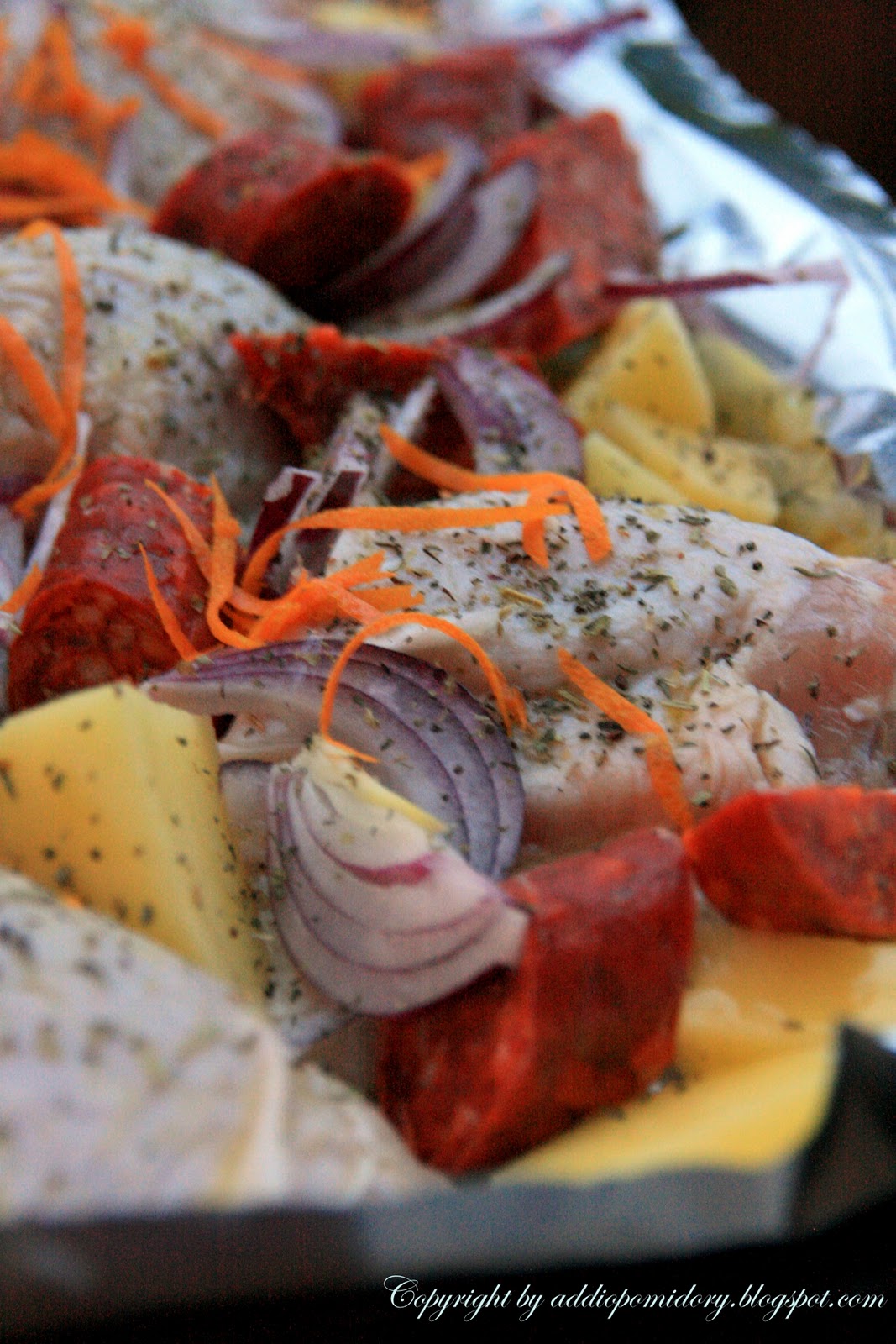 Droga Anno, dziś też śledziłam imprezowe menu:) Podanego przepisu na kurczaka z chorizo jeszcze nie próbowałam (dostałam tę książkę dosłownie kilka dni temu i z zapałem wertuję)ale mogę sobie wyobrazić, że choć z pewnością dobrze smakuje, może wyjść suchy, jeśli się go nie pilnuje… a cały urok tych "blachowych" potraw jest taki, ze wsadzasz do pieca i zapominasz. Bardzo polecam przepis na kurczaka Jamiego (z jednej z jego pierwszych książek, Jamie's Dinners) którego używamy w domu od lat, można go znaleźć na jego stronie: http://www.jamieoliver.com/recipes/chicken-recipes/tender-chicken-legs-with-tomatoes. Kurczak na oryginalnym zdjęciu wygląda na podduszony, my robimy go na blasze, więc jest bardziej chrupiący z góry – ale piekące się pomidory powodują, że nie wysycha. Jest po prostu IDEALNY do tego, żeby wstawić go przed imprezą i wyjąć, gotowy, już w trakcie… Ja urozmaicam go nieraz odrobiną bekonu i podejrzewam, że z chorizo też smakowałby super! Pozdrawiam!