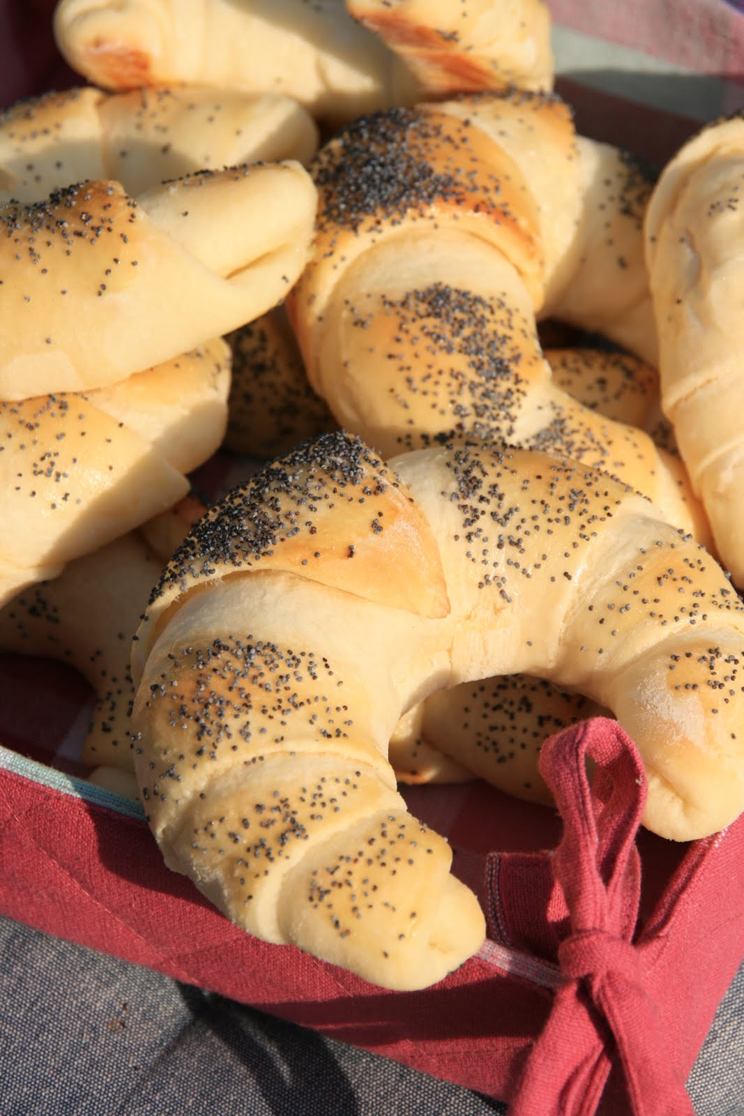 Kiedy jesteśmy daleko od domu rodzinnego nasze dzieci tesknią za rogalami z makiem, które dziadek codziennie przynosi ze sklepu. Mogą je wtedy jeść każdego dnia na śniadanie przez 2 tygodnie bez przerwy i znudzenia. Dlatego szukałam przepisu na takie rogaliki, by piec je im na co dzień, tutaj, gdy tylko będą mieli ochotę. Wypróbowałam kilka a na przepis idealny trafiłam przez przypadek, przygotowując bułgarski chleb zwany słonecznikiem. To ciasto wydawało mi się idealne. Postanowiłam zmienić trochę przepis i spróbować. I udało się. Od tamtej pory, a to już prawie rok, piekę je co kilka niedziel i zamrażam, by wyciągać wieczorem na śniadanie dnia nastepnego, nie tracą nic na świeżości, miękkości i smaku. Są niesamowite i śmiem twierdzić – o całe niebo i pół lepsze od tych kupowanych w sklepie. Pyszne i lekkie, dokładnie takie jak trzeba, na śniadanie. Na pocieszenie. By nie tęsknić tak bardzo.