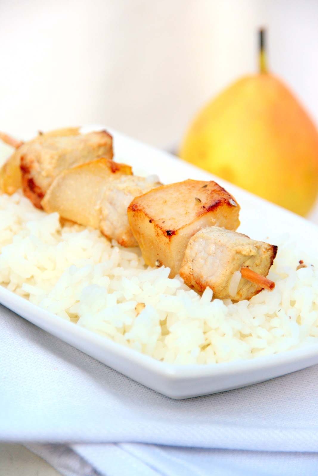 Zachęcam Was dziś do spróbowania bardzo prostego dania. Kiedy ma się w domu takiego wielbiciela dań mięsnych jak cud-mąż nie jest łatwo. Sekretem tego dania jest pozostawienie mięsa na długo, najlepiej na całą noc, w marynacie z ostrej musztardy. I to by było na tyle. Później trzeba już tylko obsmażyć mięso a potem gruszki i podawać je w formie szaszłyków – tak jak na zdjęciu lub po prostu połączone wcześniej i podawane z ryżem. Mięso jest kruche i soczyste. Polecam gorąco.
