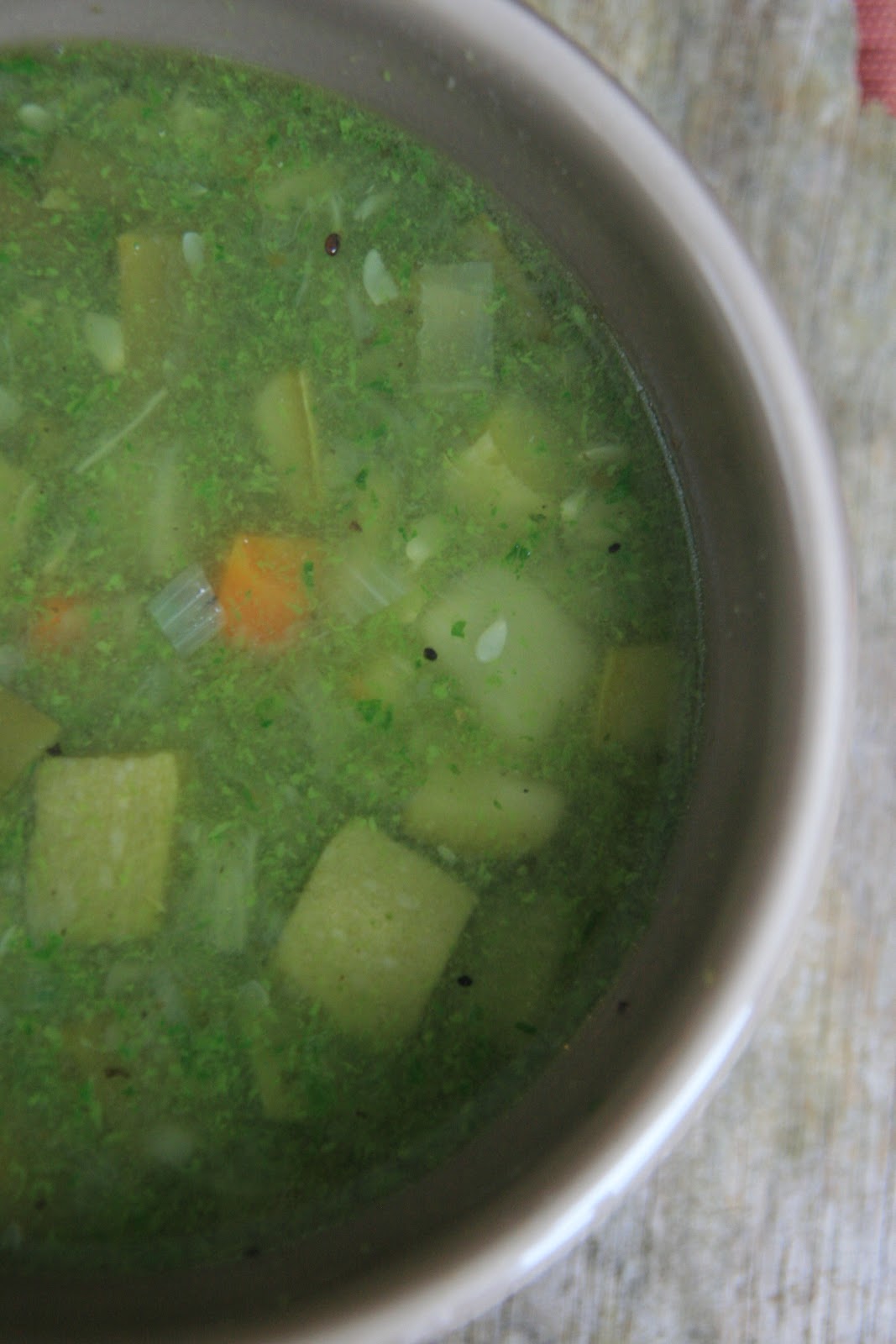 Poniżej wspomniana soupe au pistou. Zdjęcia pozostawiam niezmienione. Zresztą to, co najcenniejsze w tym daniu, jego aromat i intensywny smak, jest nie do przekazania za pomocą zdjęcia, tak samo jak, na przykład, czosnkowy zapach moich dłoni po przygotowaniu pistou.