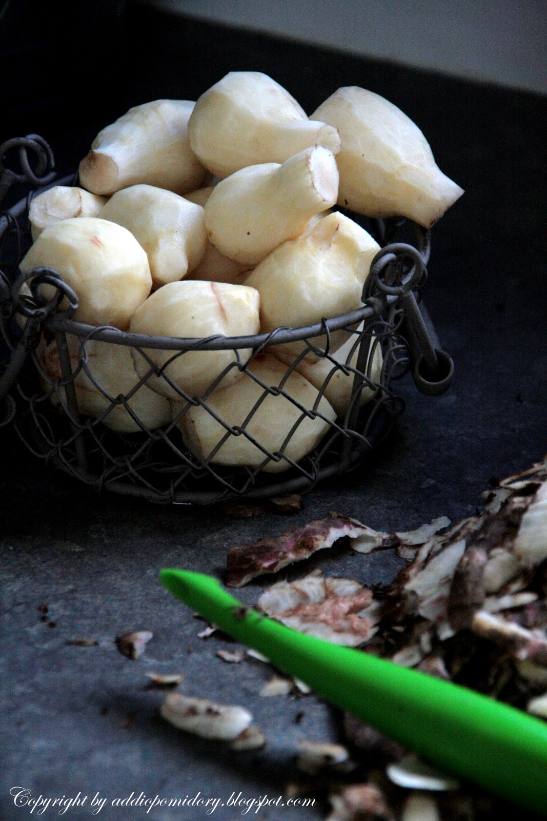 3.      Topinambur obieramy. Myjemy. Kroimy w dużą kostkę.