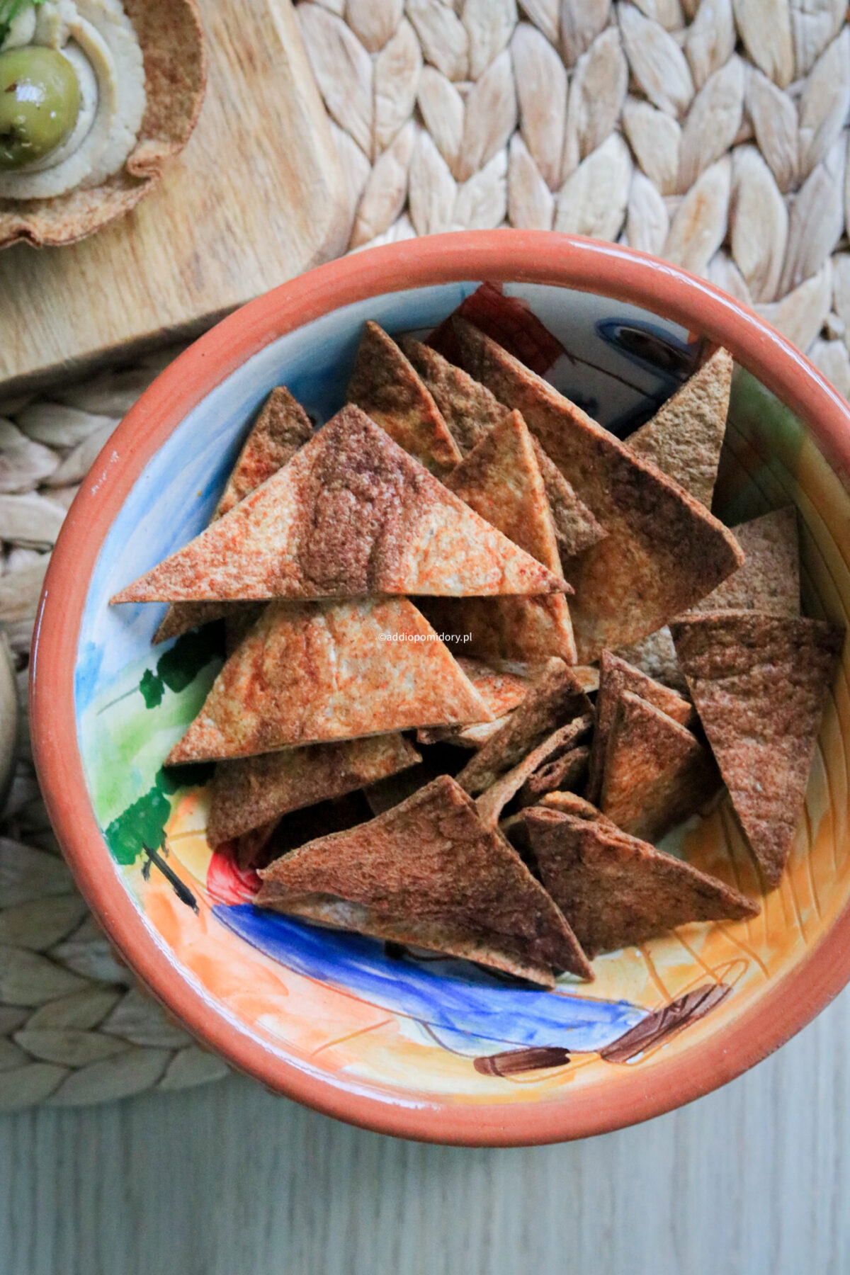 6. Z powstałych ścinków robimy „chipsy”. Możemy je jeszcze pokroić, wedle uznania. Smarujemy je oliwą, wykładamy na blaszce i pieczemy do zrumienienia. Po wystygnięciu przechowujemy podobnie jak łódeczki. Można je również po posmarowaniu oliwą oprószyć papryką w proszku. Takie lubimy najbardziej.